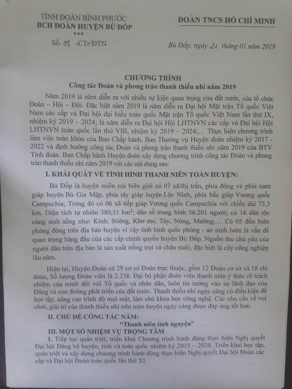 171 Số 03/CTr-ĐTN 23/01/2019 Chương trình công tác Đoàn và PT TTN năm 2019