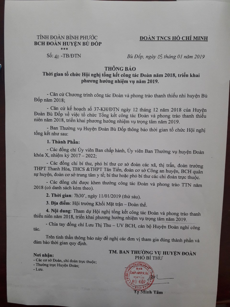 179 số 40-TB/ĐTN 02/01/2019 thông báo tổng kế công tác đoàn năm 2018