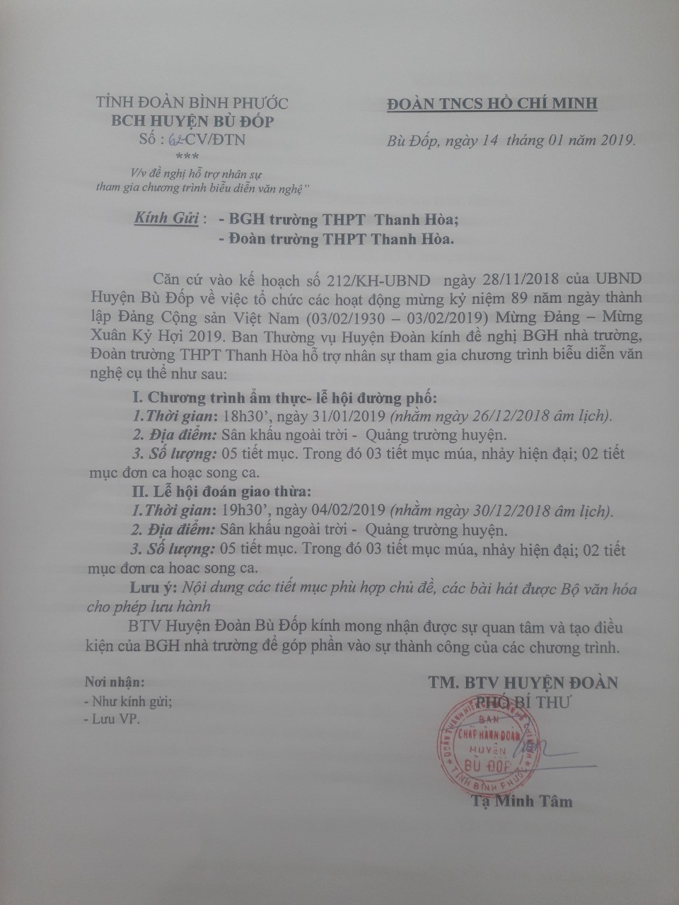 174 62/CV-HĐTN 14/01/2019 hỗ trợ văn nghệ